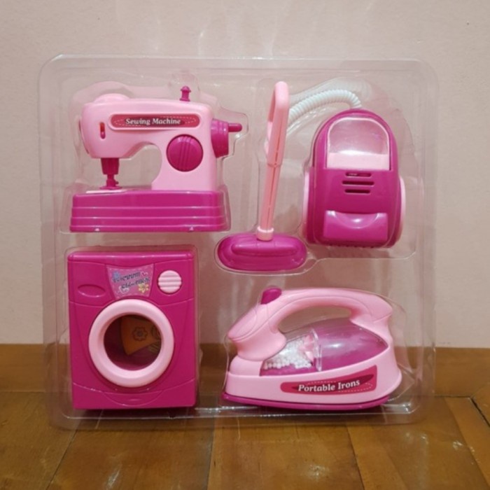 Ada pula home household set yang lebih lengkap. Home household ini terbuat dari plastik yang aman dimainkan anak-anak, 1 setnya berisi kurang lebih terdiri dari setrika yang menggunakan tenaga baterai AA 2 pcs, box pewangi, keranjang, dan jemuran yang lucu, serta papan setrika berukuran 31 x 13 x 21.5 cm. Kamu bisa menemukan mainan Home Household set ini di situs beli online yakni bukalapak.com dan shopee.co.id.