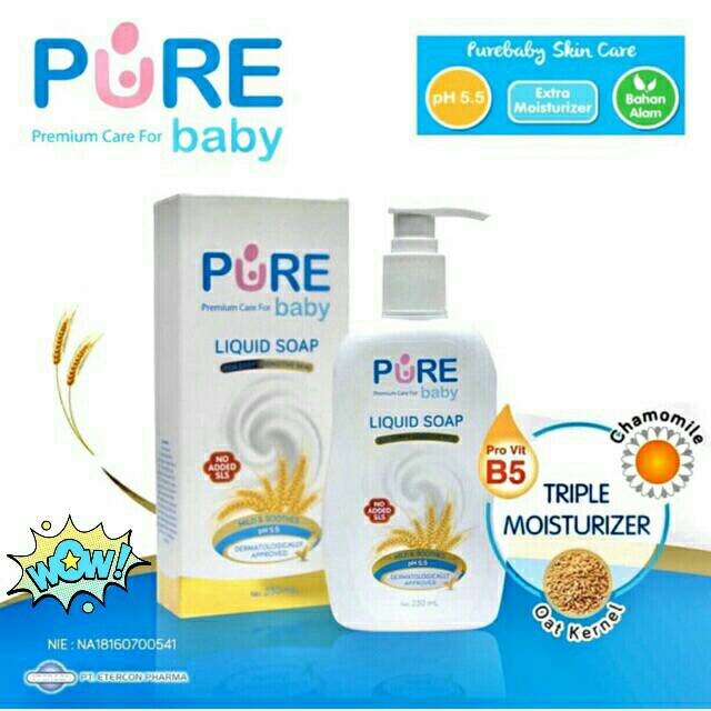 ORIGINAL Pure Baby Liquid Soap adalah sabun mandi cair yang dirancang khusus untuk merawat kulit bayi yang mengalami iritasi atau gangguan kulit seperti dermatitis, ruam, alergi, dan biang keringat. Sabun ini mengandung kombinasi alami Oat Kernel, Chamomile, dan Pro Vit B5 yang bekerja secara efektif sebagai penyembuh dan pelindung kulit sensitif bayi dari iritasi. Sabun ini mampu mengatasi rasa perih dan ketidaknyamanan pada kulit bayi, menyamarkan kemerahan akibat iritasi, serta menjaga kelembapan kulit dengan menembus lapisan kulit yang lebih dalam dan meregenerasi jaringan kulit, sehingga kulit bayi tetap halus dan lembut.