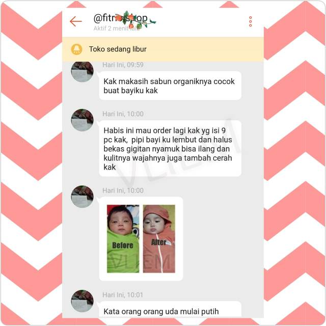 Sabun PREMIUM Pemutih Bayi Anak Organik Herbal by VLIEM adalah sabun yang bermanfaat untuk mencerahkan, memutihkan, dan menghaluskan kulit wajah dan tubuh. Selain itu, sabun ini juga dapat menghilangkan bekas gigitan nyamuk, cacar, luka kering, dan gatal, serta membersihkan sel kulit mati dan melindungi kulit dari bakteri. Keunggulannya terletak pada bahan alami yang aman untuk kulit sensitif, tanpa deterjen yang membuat kulit kusam, dan dapat digunakan oleh semua usia. Sabun ini memiliki aroma yang merilekskan pikiran, dan tanpa kandungan kimia. Dengan pemakaian yang irit dan manfaat yang luar biasa, sabun ini bisa digunakan selama 2-3 bulan.