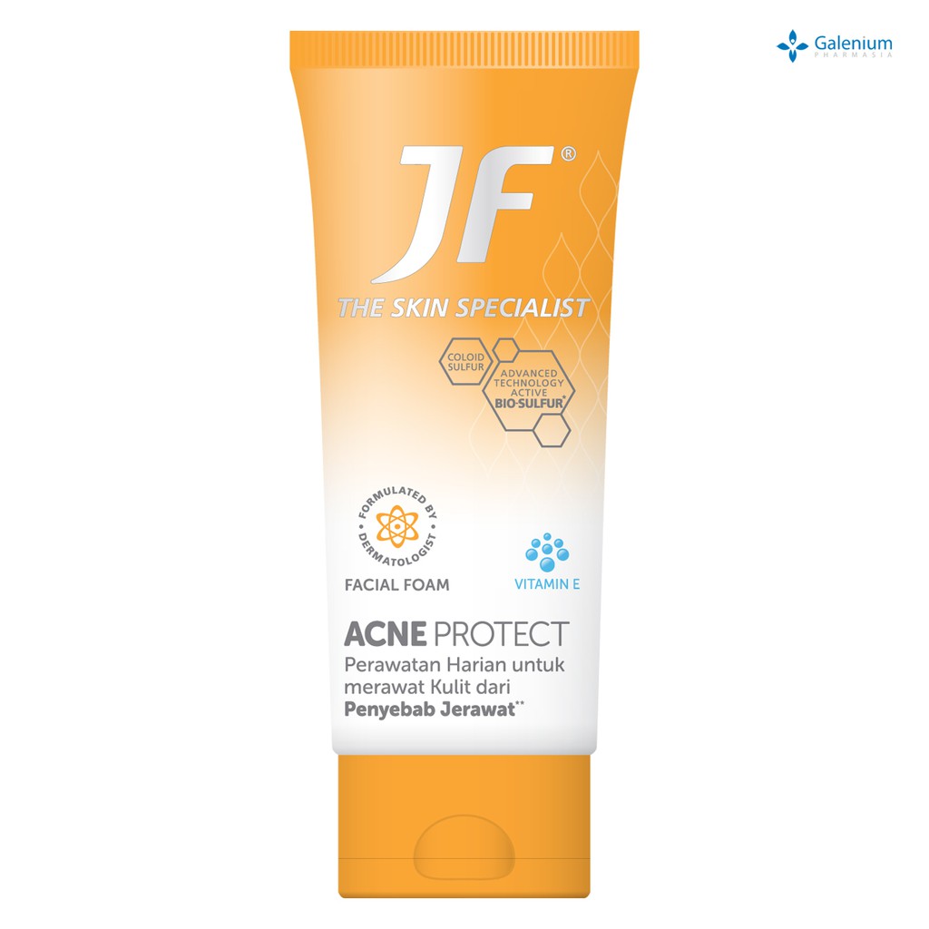 JF Acne Protect Facial Foam memiliki kandungan Active Bio Sulfur yang merupakan bahan alami untuk membantu pengangkatan sel-sel kulit mati, Jojoba sebagai moisturizer, dan Vitamin E yang membantu agar kulit tetap lembab, bersih, dan sehat.