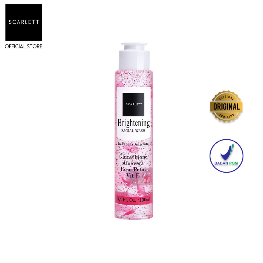 Scarlett Whitening Brightening Facial Wash mengandung Gluthatione yang membantu mencerahkan kulit, Vitamin E untuk menjaga kelembapan kulit, Rose Petal untuk menyegarkan kulit wajah, Aloe Vera yang dapat membantu merawat kekencangan kulit.