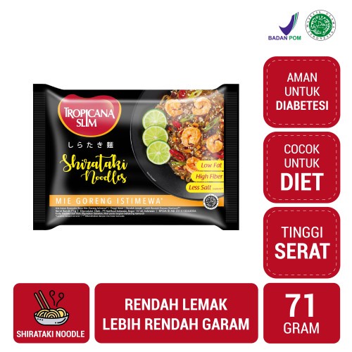 Tropicana Slim Shirataki Noodle adalah pilihan mie dari umbi shirataki yang rendah lemak dan tinggi serat, cocok untuk diabetesi dan diet. Mie ini memiliki keunggulan rendah lemak, rendah garam, tinggi serat, serta rasa yang nikmat. Dalam satu sajian hanya mengandung 100 kkal, sehingga sesuai untuk menjaga pola makan yang sehat.