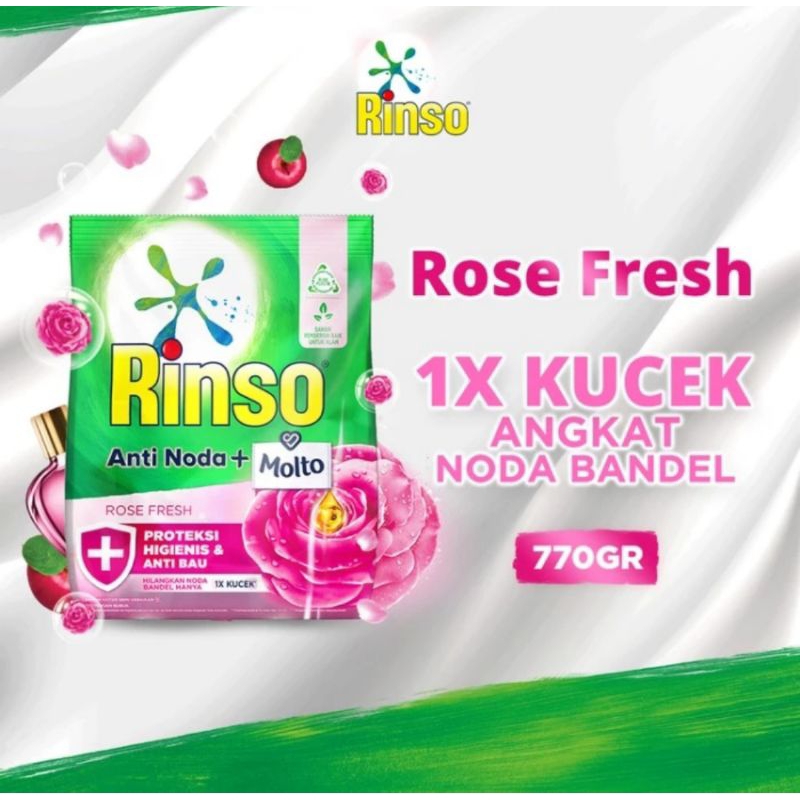 Menghadirkan kesegaran dalam setiap pencucian, Deterjen Cair Rinso Molto Rose Fresh dengan teknologi Double Clean Fresh memberikan perlindungan terhadap bakteri dan menghilangkan bau tak sedap pada pakaian. Formulasi anti noda yang efektif mampu menghilangkan noda membandel hanya dengan 1x kucek. Keharuman mempesona dari aroma Rose dan Strawberry yang tahan hingga 21 hari akan membuat pakaian terasa segar dan harum. Dengan fitur teknologi SmartFoam, busa deterjen cepat hilang sehingga menghemat air bilasan hingga setengahnya. Deterjen ini juga menjaga warna pakaian tetap cerah tanpa meninggalkan residu. Tersedia dalam berbagai ukuran kemasan, dari 20ml hingga 1.5L.