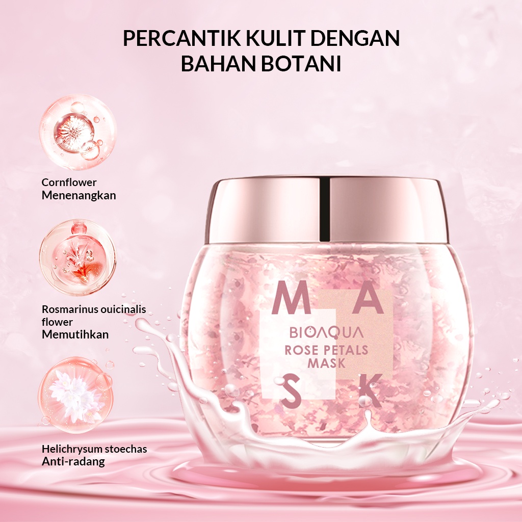 BIOAQUA Rose Petals Mask adalah masker dengan kelopak bunga mawar yang dapat memberikan perawatan yang lembut dan hidrasi pada kulit. Mengandung 3x bunga mawar, termasuk air bunga mawar yang melembapkan dan menenangkan kulit, minyak bunga mawar yang menutrisi dan melembutkan kulit, serta kelopak bunga mawar yang mencerahkan warna kulit. Masker ini juga mengandung bahan botani lainnya, seperti cornflower yang menenangkan, rosmarinus officinalis flower yang memutihkan, dan helichrysum stoechas yang memiliki efek anti-radang. Produk ini dapat digunakan dengan cara mengoleskannya pada wajah dan leher setelah membersihkan kulit, diamkan selama 15-20 menit, dan bilas dengan air hingga bersih.