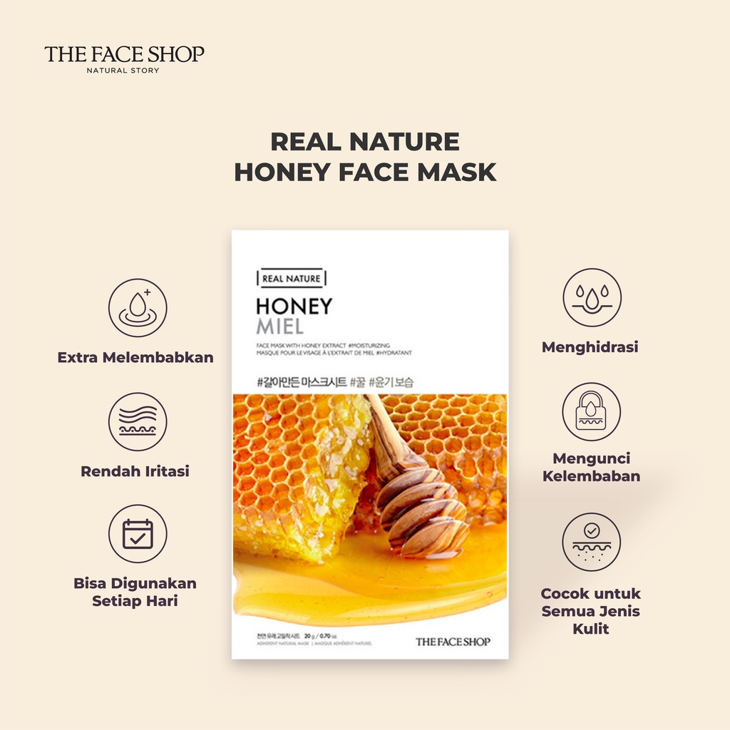 The Face Shop Real Nature Masker Wajah Honey adalah masker wajah yang cocok untuk kulit kering atau rentan jerawat. Mengandung serum madu yang menjaga kelembapan kulit dan berfungsi sebagai anti-bakteri alami. Produk ini cocok untuk semua jenis kulit, termasuk kulit sensitif. Caranya pun mudah, setelah mencuci wajah dan menggunakan toner, cukup aplikasikan masker ini pada wajah selama 1 hingga 15 menit, lalu angkat dan tepuk-tepuk dengan lembut untuk hasil yang lebih baik.