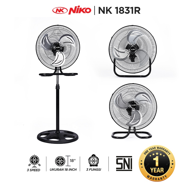 Kipas angin industri Niko NK 1831 adalah pilihan terbaik dari Niko yang dapat digunakan sebagai kipas berdiri, dinding, atau meja (3-in-1). Dengan material berkualitas dari besi dan plastik, kipas ini tidak berisik dan dilengkapi dengan sekring pengaman panas berlebih. Dengan pilihan kecepatan yang dapat diatur, kipas ini memberikan hembusan angin kencang untuk menjadikan ruangan lebih sejuk dan segar.