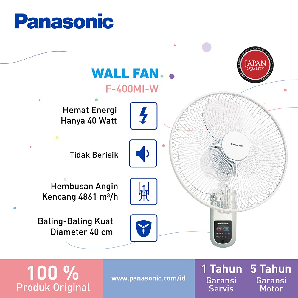 Kipas angin dinding Panasonic F-EU409 menawarkan kualitas build yang tinggi dan awet digunakan. Dengan suara motor yang tidak berisik dan baling-baling berukuran besar, kipas ini memberikan hembusan angin yang mantap dan nyaman. Dilengkapi dengan fitur automatic oiling system dan garansi motor selama 5 tahun, produk ini dirancang untuk memberikan performa yang maksimal dan tahan lama.