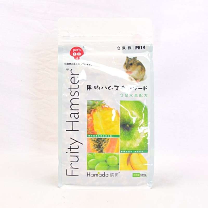 Pets 88 Fruity Hamster Food adalah makanan hamster berbahan dasar buah-buahan yang kaya dan beragam. Produk ini mengandung buah-buahan kering seperti pisang, papaya, nanas, anggur, dan apel, serta oatmeal, cincin rumput, biji bunga matahari, kacang tanah, dan granul biji-bijian khusus yang membantu mengurangi bau tidak sedap selain memberikan nutrisi yang tinggi. Makanan ini cocok untuk hamster segala usia, terutama hamster betina yang sedang menyusui, hamster muda, dan hamster yang sedang pulih dari sakit. Pets 88 Fruity Hamster Food kaya serat pangan, kalsium, zat besi, asam amino yang penting untuk pertumbuhan hamster, serta protein seimbang yang meningkatkan daya tahan tubuh hamster dan menjaga kecerahan bulu mereka.