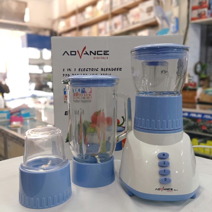 Pilihan lainnya Advance Blender BL-5 3in1 Bahan Kaca Low Watt with Grinder dan Mini Chopper. Tersedia dengan warna biru putih, blander ini memiliki grinder dan mini chopper.