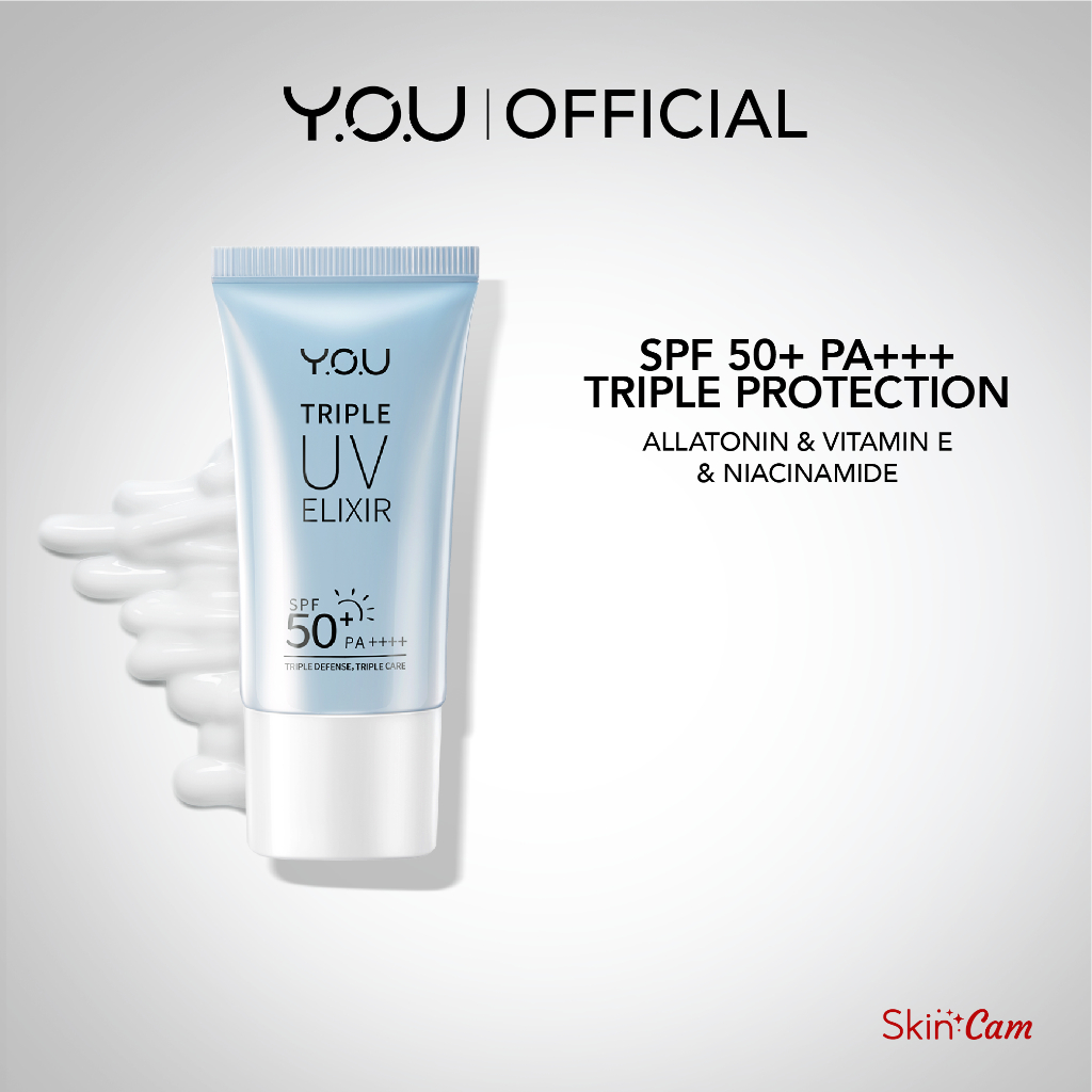 YOU Triple UV Elixir Sunscreen adalah tabir surya dengan tekstur ringan berbasis air yang mengandung chemical sunscreen untuk perlindungan terhadap sinar UVA, UVB, dan blue light. Diperkaya dengan Allantoin, Vitamin E, Niacinamide, dan Centella Asiatica, produk ini juga memberikan nutrisi pada kulit. Cocok untuk kulit berminyak dan berjerawat, sunscreen ini memberikan manfaat melindungi kulit dari sinar matahari, menghidrasi, dan menenangkan kulit yang bermasalah. Mengandung bahan-bahan seperti Allantoin, Niacinamide, Centella Asiatica, dan Vitamin E, sunscreen ini membantu menjaga kesehatan kulit dengan mengurangi hiperpigmentasi, memperkuat sistem perlindungan kulit, dan memberikan efek antioksidan.