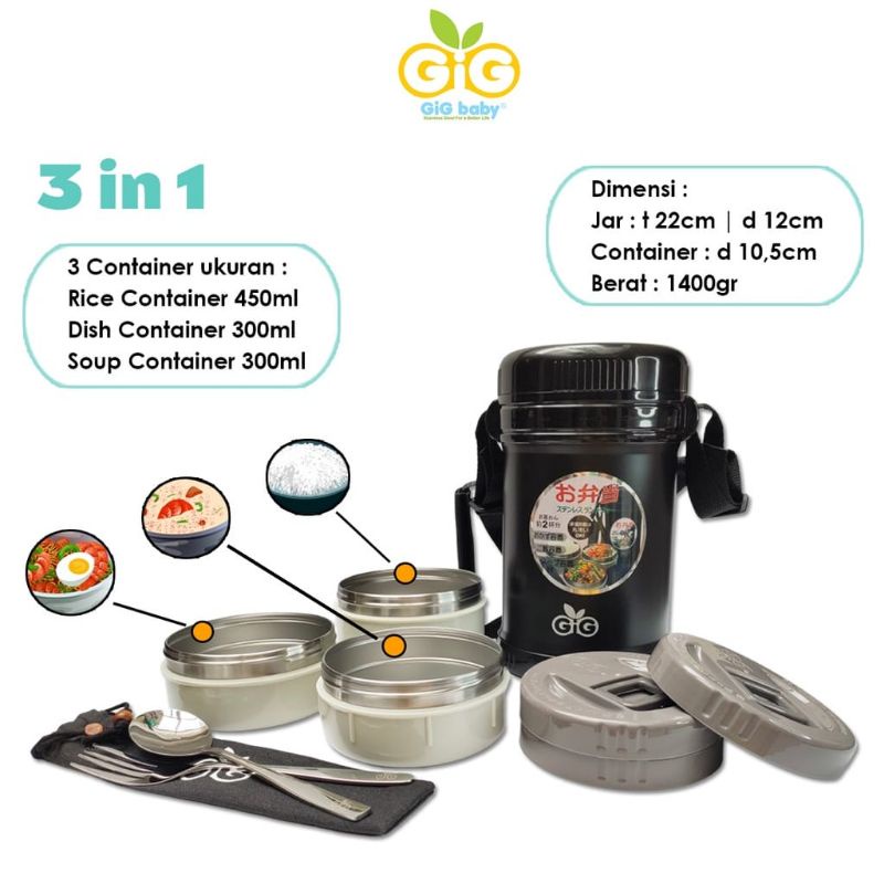 Gig Baby Premium Lunch Jar adalah pilihan sempurna untuk menjaga makanan Anda tetap panas dan aman. Dengan tiga ukuran yang tersedia (1,3 liter, 1,5 liter, dan 1,7 liter), lunch jar ini terbuat dari bahan stainless steel 304 untuk bagian wadah, serta food grade silicone rubber dan poly propylene (PP) untuk bagian penutupnya.