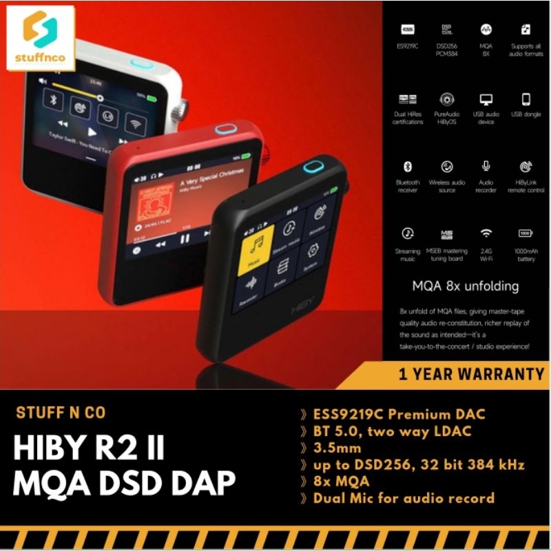 HiBy R2 adalah MP3 player terbaik dengan layar sentuh, kualitas Hi-Fi, dan dukungan Bluetooth dan Wi-Fi. Dukungan MQA, konektivitas Bluetooth V5.1 dengan UAT Transmission, dan MSEB Audio Tuner menawarkan pengalaman mendengarkan musik berkualitas tinggi. Fitur dual mikrofon untuk merekam audio berkualitas stereo dan daya tahan baterai hingga 15 jam menambah nilai keunggulan dari HiBy R2. Pemutar musik mungil ini membawa performa Hi-Res dengan chip DAC ES9219C berkualitas tinggi, mendekode PCM hingga 32-Bit/384kHz, dan DSD hingga DSD256 secara native.