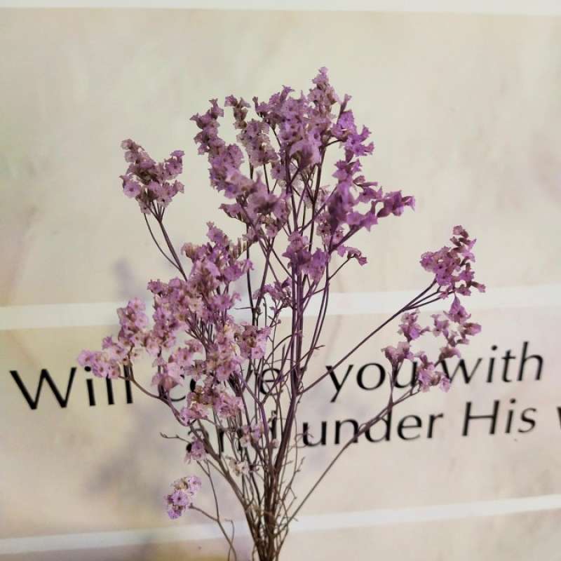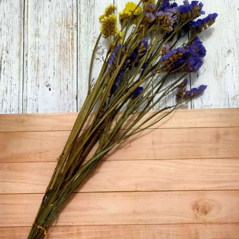 Limonium Purple, bunga kering yang tahan layu, ideal untuk dekorasi ruangan dan penggunaan dekoratif. Limonium, bunga pengisi yang populer dalam karangan bunga segar dan kering, memiliki bentuk malai lepas dengan batang berduri, bersayap, dan bercabang, dengan panjang sekitar 61-91 cm. Warna utama meliputi biru, ungu, lavender, dan varian lainnya seperti putih, merah muda, dan kuning. Simbol kesuksesan, keindahan, simpati, dan kenangan, juga sering digunakan untuk menyampaikan rindu kepada orang yang dicintai.