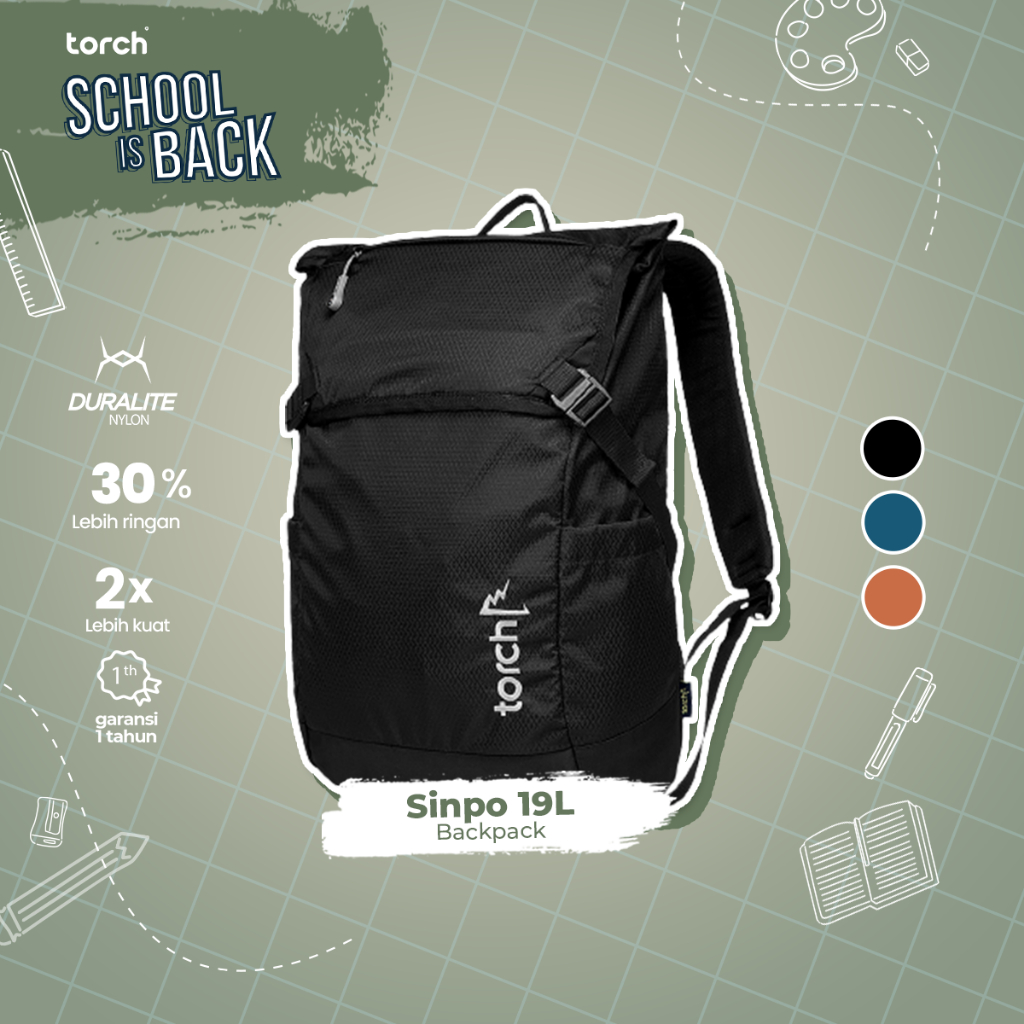 TORCH Backpack merupakan tas ransel dengan kapasitas 19 liter dari koleksi Sinpo yang hadir dengan warna baru, yaitu Terracota. Tas ini terbuat dari bahan Duralite Nylon yang telah teruji anti air dan memiliki kekuatan dua kali lebih kuat serta 30% lebih ringan. Desainnya yang casual cocok digunakan untuk pergi ke kantor, kampus, atau sekolah. Dilengkapi dengan berbagai fitur seperti kompartemen utama yang dapat menampung banyak barang dan kompartemen khusus untuk laptop 14 inci, saku atas untuk menyimpan tissue pack atau headset, saku samping untuk tumbler atau payung lipat, rain cover untuk melindungi tas dari hujan, dan Back System TRD Foam Canal yang membuat pemakaian tas menjadi nyaman.