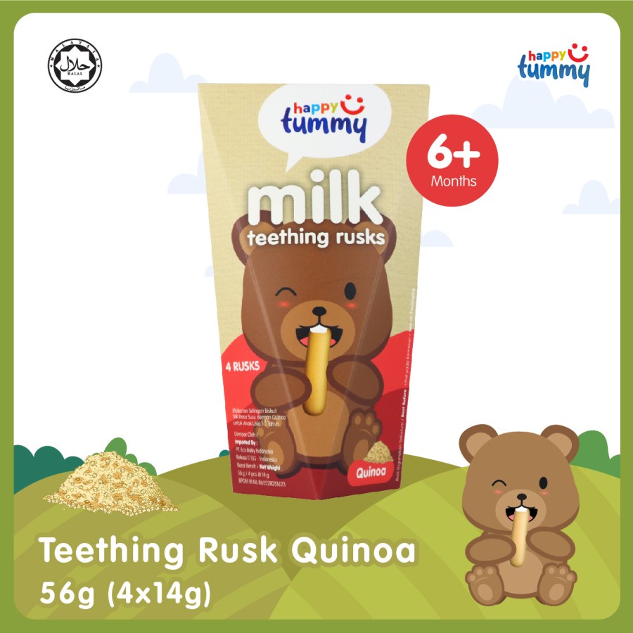 Happy Tummy Teething Biscuit adalah biskuit yang dirancang khusus untuk bayi yang sedang tumbuh gigi. Dalam fase ini, bayi dapat merasakan ketidaknyamanan pada gusinya. Untuk mengatasi hal ini, Happy Tummy Teething Biscuit dapat diberikan kepada bayi. Biskuit ini akan melatih bayi untuk mengenal makanan padat dan menguatkan rahangnya. Tersedia dalam varian rasa original dan quinoa, setiap kemasan Happy Tummy Teething Biscuit berisi empat biskuit yang dikemas secara terpisah. Biskuit ini aman dan efektif untuk meredakan rasa sakit saat bayi tumbuh gigi, merangsang dan menenangkan gusi yang sakit saat digigit oleh bayi.