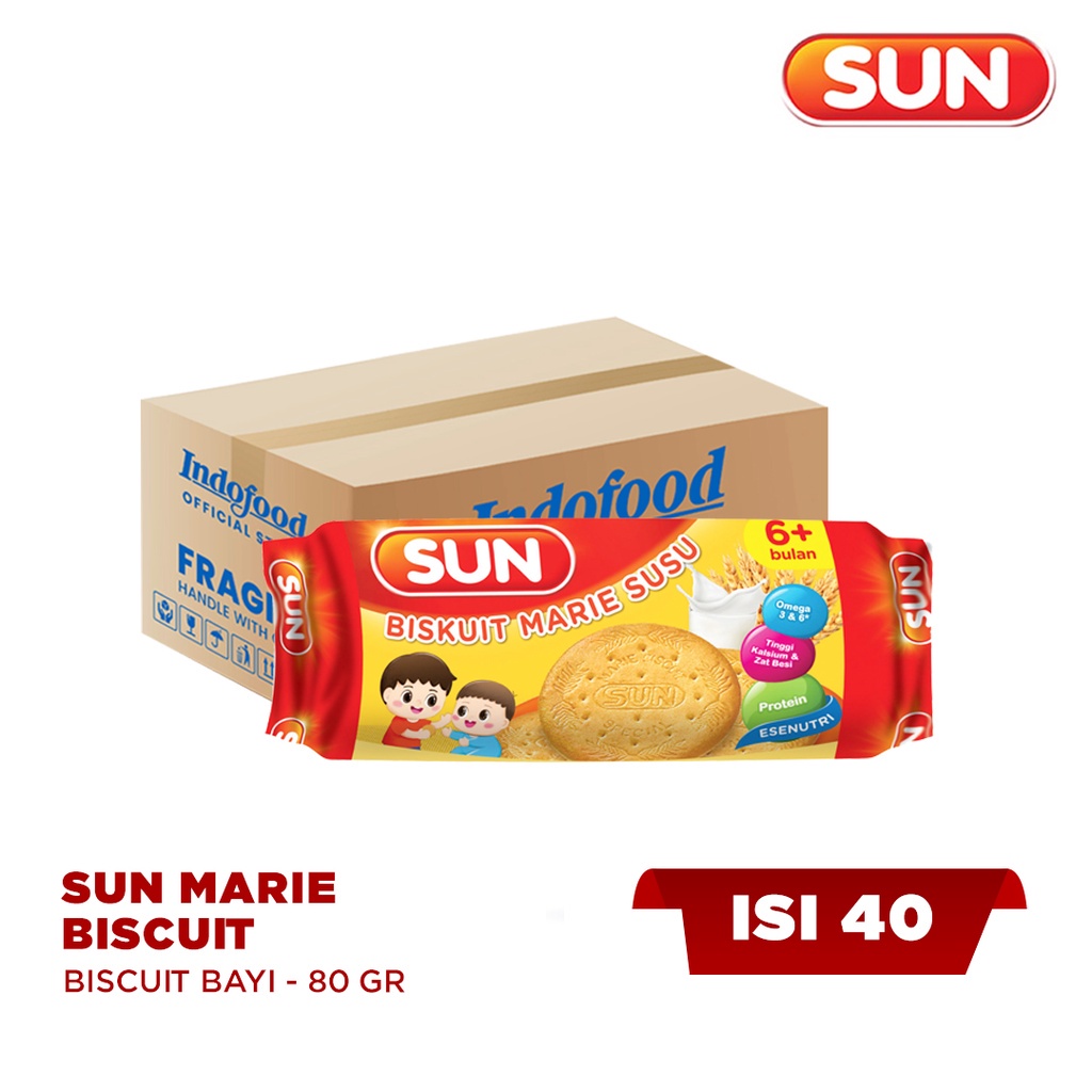 Sun Marie Biscuit merupakan biskuit bayi yang kaya gizi tanpa gula dan garam yang terkenal di kalangan ibu-ibu. Kandungan nutrisinya sangat bermanfaat untuk pertumbuhan dan perkembangan Si Kecil. Biskuit ini telah menjadi makanan pendamping ASI sejak tahun 1980-an untuk bayi usia 6 bulan ke atas. Biskuit bundar pipih ini dapat disajikan dalam bentuk bubur atau dimakan utuh. Rasanya yang kuat akan susu membuat bayi menyukainya. Biskuit ini mengandung susu, protein, kalsium, dan zat besi yang penting untuk perkembangan otot, tulang, gigi, dan pembentukan sel darah merah. Tersedia dalam dua varian rasa lezat: Pisang dan Susu & Madu.