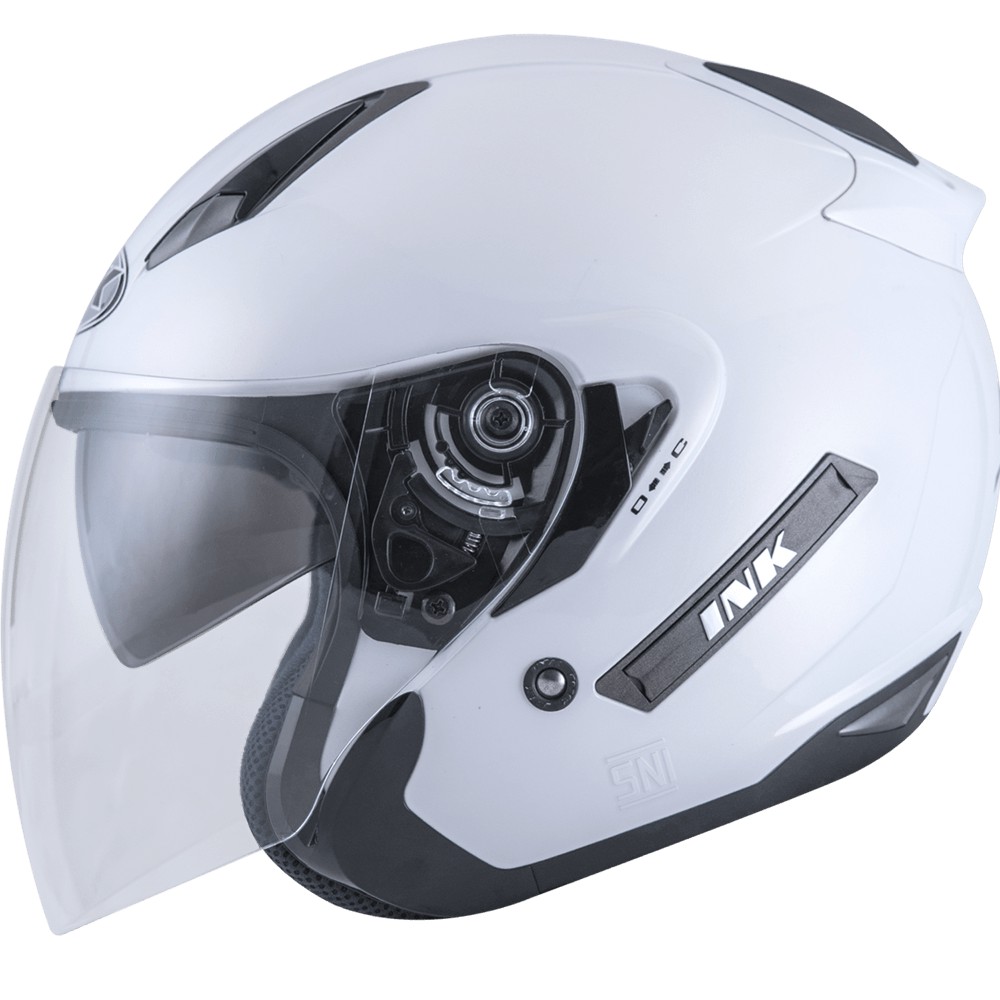 INK T1 Solid Helm Open Face adalah helm open face trendy dengan warna putih solid. Helm ini dilengkapi dengan double visor, sun roof system di bagian pad, automatic release safety buckle, serta sistem anti maling untuk menghindari pencurian. Helm ini berstandar DOT dan SNI 1811-2007, serta bagian dalamnya mudah dilepas dan dicuci. Tujuan utama penggunaan helm ini adalah untuk melindungi kepala dari benturan yang mungkin terjadi saat mengalami kecelakaan atau terjatuh dari motor. Dengan perlindungan maksimal pada area kepala, helm ini dapat meminimalisir dampak atau resiko kecelakaan, menjaga keamanan dan keselamatan pengendara saat berkendara di jalan raya.