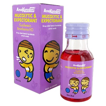 Anakonidin Mucolytic & Expectorant adalah sirup obat batuk berdahak yang cocok untuk anak-anak usia 2-12 tahun. Dengan rasa blueberry, obat ini mengandung Guaifenesin 50 mg dan Bromhexine HCl 4 mg setiap sendok takar (5 ml), berfungsi untuk mengencerkan dahak agar lebih mudah dikeluarkan. Aturan pakai yang dianjurkan adalah 1/2 sendok takar (2.5 ml) untuk anak usia 2-6 tahun dan 1 sendok takar (5 ml) untuk anak usia 6-12 tahun, diambil 3 kali sehari. Obat ini digunakan untuk meredakan batuk berdahak pada anak. Simpan obat pada suhu di bawah 30°C dengan kemasan botol berukuran 60 ml.