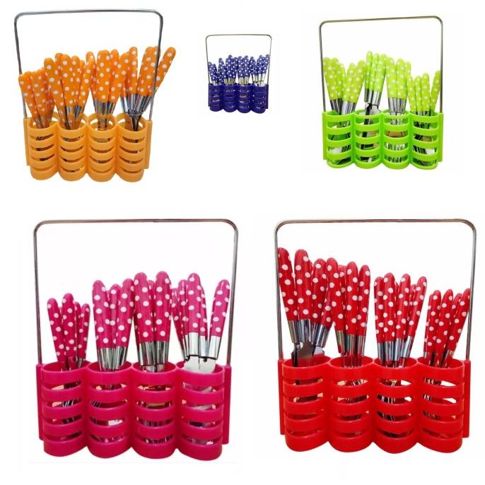 Dalam 1 set terdiri dari 24 pcs dan dilengkapi dengan keranjang tempat sendok dan garpu tersebut. Motifnya yang polkadot membuat tampilan meja makan menjadi lebih menarik dan rapi. Dalam 1 setnya terdiri dari 6 buah sendok makan, 6 buah garpu makan, 6 buah sendok kue, dan 6 buah pisau steak. Untuk pilihan warna polkadotnya ada biru, merah, dan hijau.
