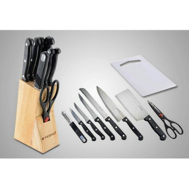 Pisau Dapur Set dari Vicenza ini bisa jadi rekomendasimu. Pisau set ini berisi 6 buah pisau, sebuah gunting, pengupas, 1 rak kayu, dan juga sebuah talenan. Sebuah set pisau yang cukup lengkap dan pas bila digunakan sebagai kado. Pisau ini memiliki 5 varian warna, yakni hitam, pink, biru, biru muda, dan hijau.