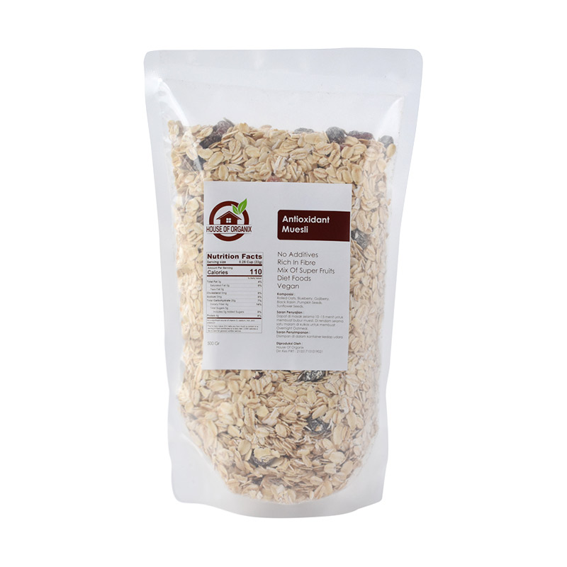 House Of Organix Antioxidant Muesli merupakan pilihan sarapan yang menyehatkan dengan kombinasi rolled oat, blueberi, goji beri, kismis hitam, dan kranberi. Sarannya adalah untuk mencampurkannya dengan susu dan memasak dengan api kecil, atau direndam dengan susu semalaman di dalam kulkas untuk dikonsumsi esok hari. Muesli ini tinggi serat, tinggi antioksidan, tanpa pengawet alami, dan alami untuk kesehatan jantung.