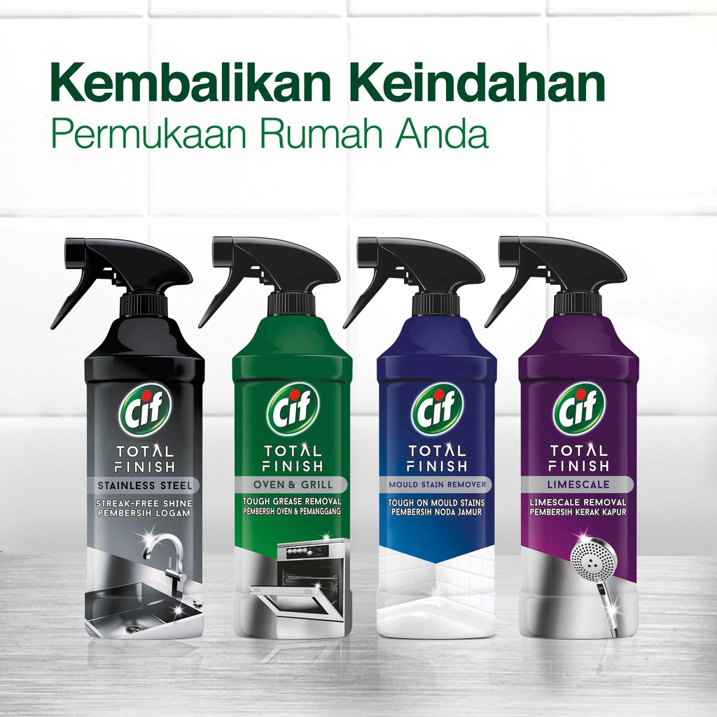 Cif Total Finish merupakan rangkaian pembersih khusus untuk noda tertentu. Variannya terdiri dari Mould Stain Remover Specialist Cleaner Spray, Oven & Grill Spray, Stainless Steel Spray, dan Limescale Spray Anti Kerak Kapur. Cif Total Finish efektif menghilangkan noda di sekitar rumah Anda.