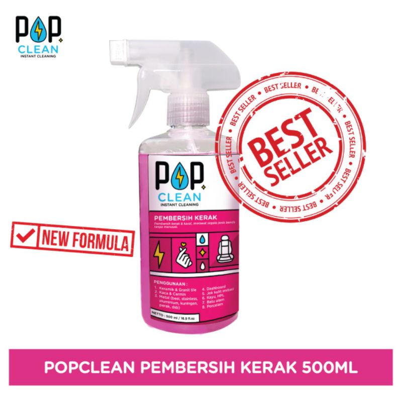 Pop Clean adalah pembersih yang diformulasikan menggunakan asam organik yang aman dan ramah lingkungan untuk membersihkan lapisan kerak sabun, kerak kapur, noda karat, kerak air, mineral deposit, tumpukan daki minyak, dan noda membandel lainnya yang menempel pada permukaan material seperti granite-tile, porcelain-tile, batu alam, terasso, kaca, stainless dan galvanize.