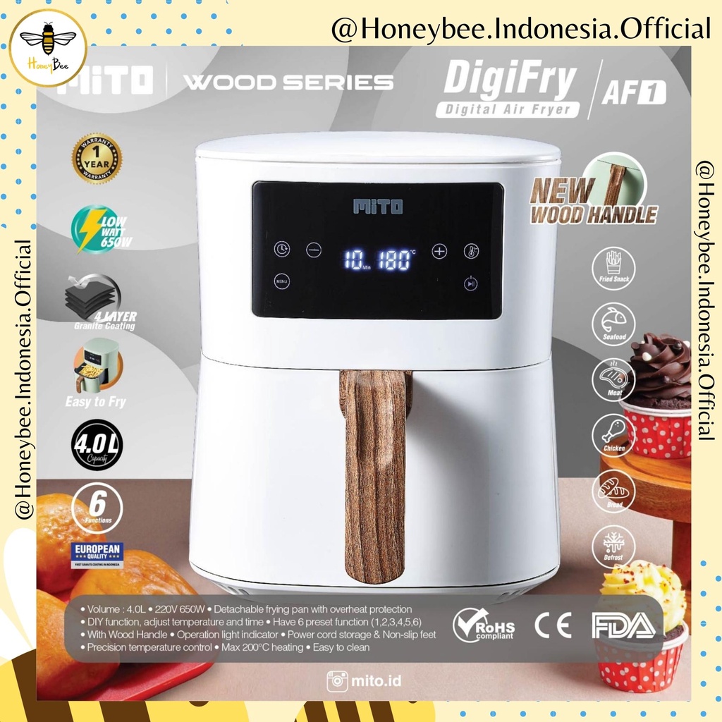 Terdapat 7 mode memasak yang umum digunakan, termasuk untuk memasak daging ayam, ikan, udang, dan kentang goreng, sehingga hasil masakan menjadi lebih presisi. Air Fryer ini juga dilengkapi dengan fitur seperti penyimpanan kabel daya dan kaki anti-selip. Dalam hal keamanan, Air Fryer Mito AF1 WOOD SERIES menggunakan material dengan lapisan granite yang tahan suhu tinggi dan bahan kimia. Dengan desain yang elegan dan fitur-fitur unggulannya, Mito AF1 WOOD SERIES Digital Air Fryer adalah pilihan yang tepat untuk memasak makanan sehat dan lezat di rumah.