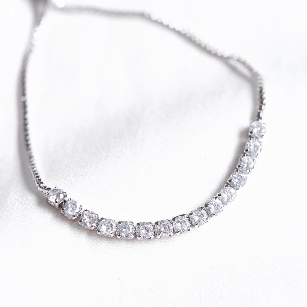 Terbuat dari bahan rhodium, gelang ini dihiasi dengan kristal zirconium yang memancarkan kilauan yang elegan. Anda hanya perlu mendorong dan menarik pengunci serutnya untuk mengatur ukuran gelang sesuai keinginan. Dengan desain inovatif dan fungsional, gelang ini memberikan kenyamanan dan gaya yang sempurna untuk setiap kesempatan.