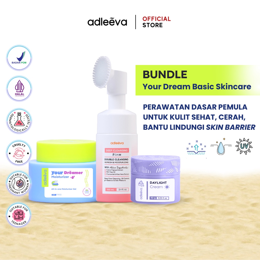 Adleeva Your Dream Basic Skincare Kit merupakan pilihan yang tepat bagi pemula dalam perawatan kulit. Deep Cleansing Foam membersihkan wajah secara menyeluruh, sementara Your Dreamer Moisturizer memberikan kelembapan dan nutrisi yang dibutuhkan kulit. Daylight Cream / Sunscreen melindungi kulit dari paparan sinar matahari. Produk-produk Adleeva ini memiliki kandungan bahan-bahan berkualitas seperti ceramide, hyaluronic acid, dan lainnya yang membantu memperbaiki skin barrier, menyamarkan noda dan bekas jerawat, serta memberikan kelembapan yang tahan lama. Harganya yang terjangkau membuatnya menjadi pilihan yang terbaik bagi yang mencari perawatan kulit berkualitas dengan efek yang nyata.