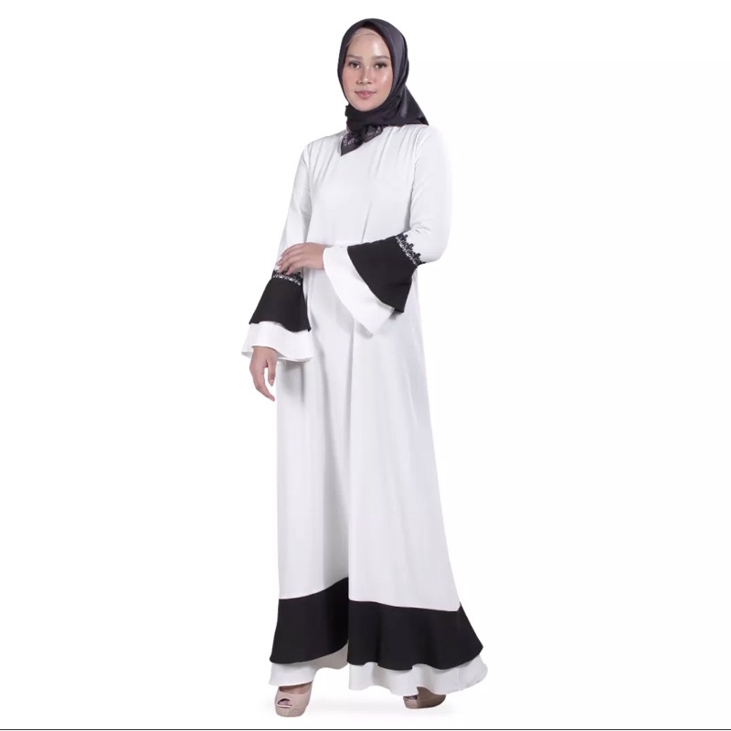 Dress Kagumi dari Zoya ini memiliki tampilan yang cantik dan bagus saat dipakai. Dengan dominasi warna putih yang lebih ke off white. Pada bagian tangan berbentuk lonceng dengan dua warna hitam dan putih serta garis bordir. Gamis ini juga memiliki resleting pada bagian belakang, sehingga tidak busui friendly.