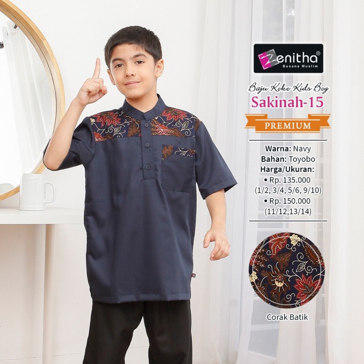 Anda suka dengan corak batik sebagai motif untuk baju koko anak? Baju Koko Anak Boy Sakinah Premium Zenitha bisa jadi pilihan untuk anak Anda. Baju koko juga bisa dijadikan sarimbit bersama keluarga.