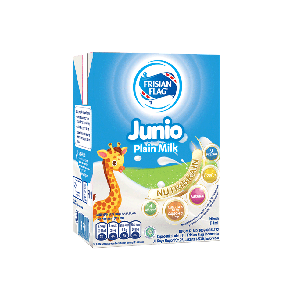 Frisian Flag Junio merupakan susu UHT mini yang diformulasikan untuk anak dengan ukuran 110 ml, produksi PT Frisian Flag Indonesia. Susu UHT mini ini memiliki 9 jenis vitamin, yakni vitamin A, D, B1 dan B2, B3, B6, dan B12. Tak hanya itu, Frisian Flag Junio juga mengandung 6 mineral penting, seperti kalsium, fosfor, magnesium, iodium, zink, dan selenium. Asupan protein, vitamin, dan mineral harian anak akan tercukupi sampai 6% dengan 2 kotak susu UHT mini ini.