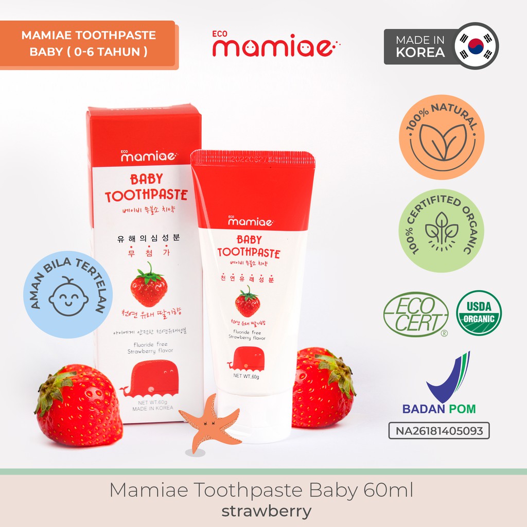 Mamiae Baby Organic Toothpaste memiliki kandungan bahan-bahan natural yang terkandung didalamnya. Pasta gigi anak ini juga sudah di sertifikasi oleh Ecocert, contohnya seperti Greentea Extract dan Grapefruit Seed Extract. Apalagi Mamiae diklaim sebagai pelopor pasta gigi anak dengan Antioxidants di Korea.