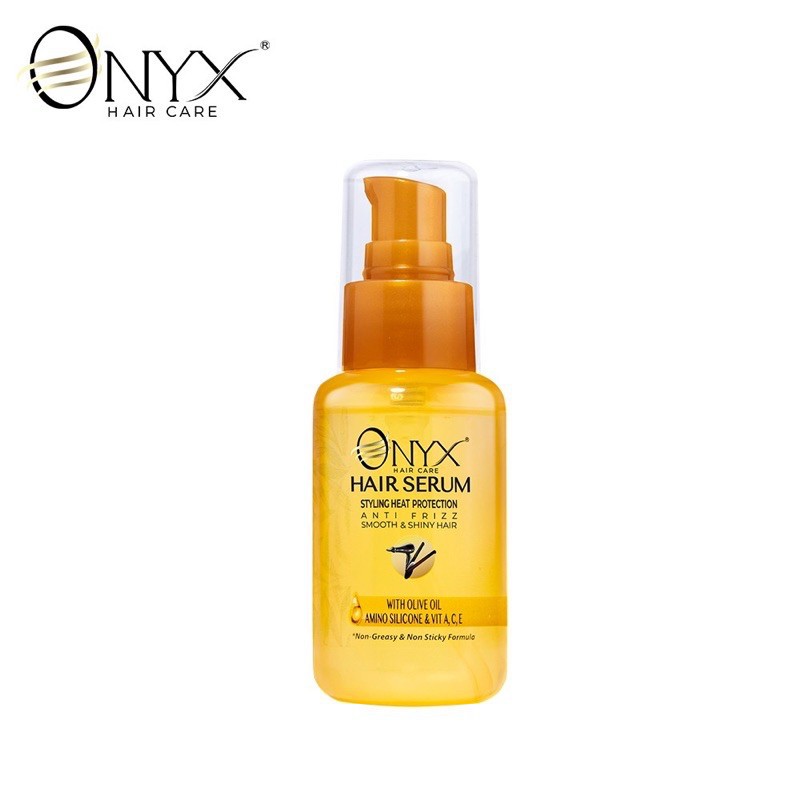 Onyx Hair Care Hair Serum - Styling Heat Protection adalah serum rambut yang melindungi dari panas penggunaan alat styling, mengandung Thermal Protection Agent dengan Amino Silicone, Olive Oil, dan Multivitamin A, C & E untuk merawat rambut rusak. Serum ini membuat rambut tidak kusut, mudah diatur, halus, dan berkilau. Dengan tekstur yang tidak berminyak dan lengket, produk ini memberikan keharuman floral yang segar dan tahan lama. Penggunaan rutin akan memberikan perubahan pada rambut sejak pemakaian pertama, menjadikan rambut tampak indah dan terlindungi dalam jangka panjang.