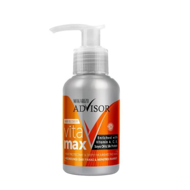 Makarizo Advisor Vitamax adalah vitamin rambut pertama yang berfungsi sebagai hair treatment dan heat protectant. Produk ini melindungi rambut dari panas alat catok, membantu mencegah kerusakan rambut, dan tidak membuat rambut lepek atau lengket. Mengandung multivitamin A, C, dan E, Vitamax menjaga kesehatan batang rambut dan melindungi dari radikal bebas saat beraktivitas di luar. Cara penggunaannya adalah dengan mengoleskan pada batang rambut setengah basah setelah keramas, tanpa perlu dibilas lagi, sehingga rambut tampak sehat dan berkilau sepanjang hari.