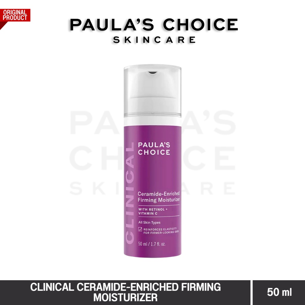 Paula’s Choice Clinical Ceramide-Enriched Firming Moisturizer merupakan pelembap anti-aging dengan konsentrasi retinol 0,1% yang dapat menghaluskan keriput, meningkatkan kelembaban, dan menjaga kulit kencang dan kenyal. Formulanya unik dengan kombinasi ceramide, retinol, dan vitamin C yang belum pernah ada sebelumnya, serta CollagenSupport Complex yang berfungsi sebagai bahan pengikat untuk menjaga lapisan luar kulit tetap terhidrasi. Pelembap ini direkomendasikan digunakan pada malam hari sebagai langkah terakhir dalam rutinitas perawatan kulit, dan perlu diingat untuk menghindari penggunaan bersamaan dengan produk vitamin C atau retinol lainnya untuk menghindari tanda-tanda sensitivitas kulit.