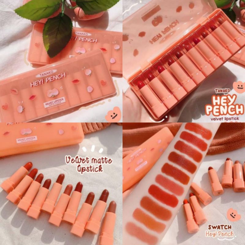 MATTE LIPSTICK Tanako Hey Peach Lipstick adalah lipstik matte tahan lama yang terdiri dari 10 varian warna dalam satu box. Warna peach merupakan pilihan ideal untuk menciptakan riasan natural yang cerah pada bibir dengan kulit gelap. Untuk hasil yang terbaik, pilihlah shade peach yang sedikit lebih gelap agar tidak terlihat terlalu mencolok saat digunakan.