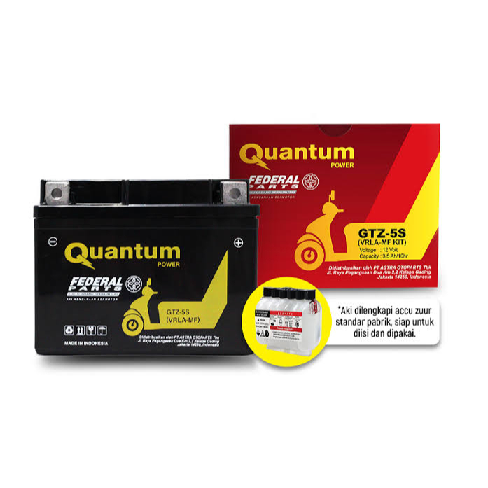 Aki Quantum Federal GTZ5S merupakan aki motor yang tahan lama berkat kemampuannya menyimpan setrum lebih lama dan tidak mudah soak. Kelebihannya adalah menggunakan teknologi VRLA yang memungkinkan Anda menghemat waktu karena tidak perlu melakukan pengecekan dan penambahan air aki secara berkala.