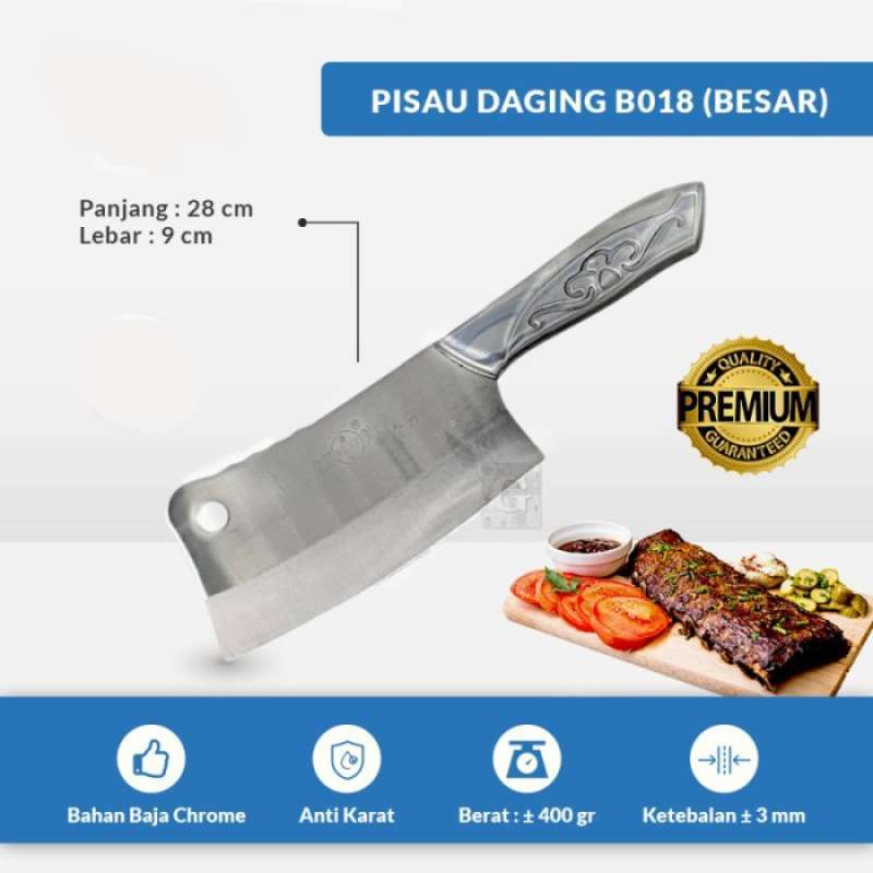 Pisau Daging Golok B018 dirancang dengan desain unik yang memungkinkan penggunaan baik untuk membacok tulang maupun memotong sayuran. Dengan ketebalan 3mm, lebar 9cm, dan panjang pisau 16,5cm, pisau ini sangat tangguh dan tajam. Terbuat dari baja chrome anti karat, menjadikannya pilihan yang andal untuk kebutuhan dapur sehari-hari. Dengan spesifikasi yang mencakup fungsi dapur, dimensi produk 20 x 10 x 10, dan berat 450 gram, Pisau Daging Golok B018 menjadi opsi praktis dan handal untuk berbagai keperluan memasak.