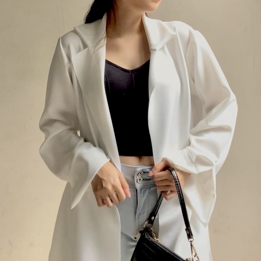 Tampilan ini akan sangat cocok untuk kamu yang suka dengan tampilan modern dan boyish. Kamu bisa menggunakan sepatu kets ataupun high heels untuk dipadukan. Jangan lupa juga pilih dalaman polos atau crop agar penampilan kamu semakin menarik.