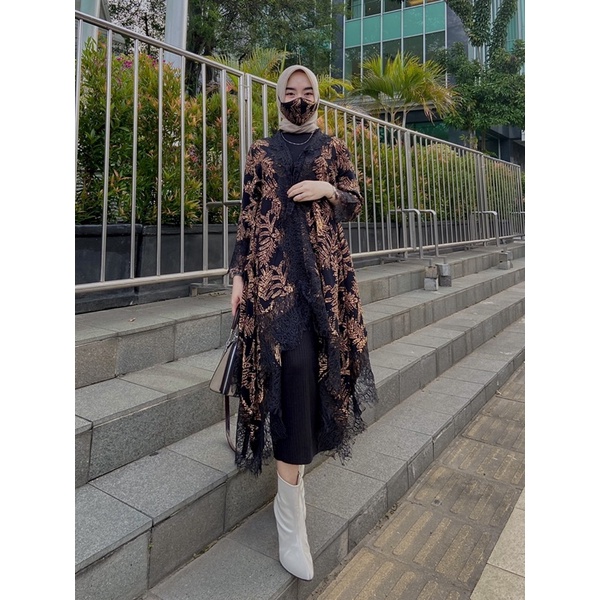 Outer batik yang satu ini juga tidak kalah menarik. Dengan warna bold yang mewah, outer ini bisa bikin penampilan kamu mewah sekali, lho. Apalagi dengan bahan lace dan aksen daun berwarna gold di atas kain hitam. Kamu akan jadi pusat perhatian ketika menghadiri wisuda pasangan.