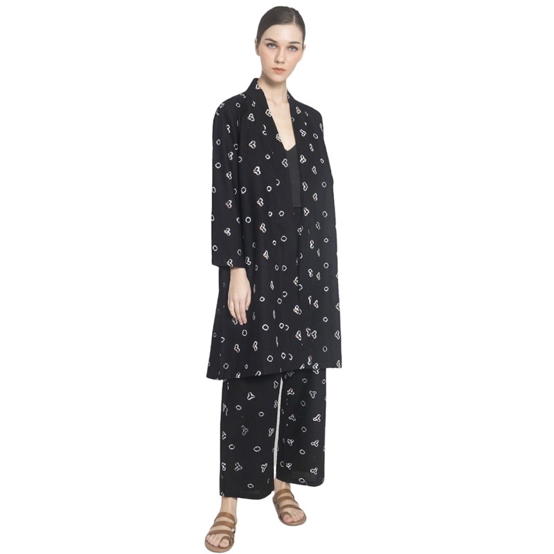 Setelan outer shibori jumputan terdiri dari outer dan celana dengan motif shibori jumputan yang sedang ngetren. Motif ini memiliki kesan simpel tapi juga rapi dan anggun. Kamu bisa mengenakan outer-nya saja untuk dipadukan dengan rok atau celana sesuai selera kamu.