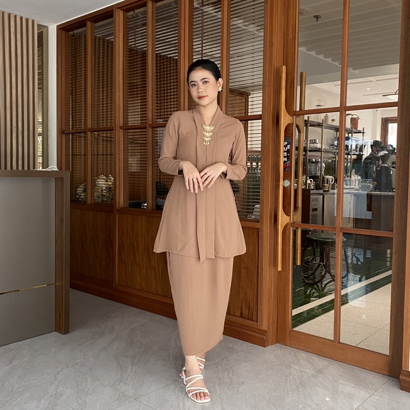 Kamu bisa membeli satu set atasan tunik kebaya dengan rok batik, atau cukup memadukan atasannya dengan rok atau celana bahan. Pemilihan kebaya seperti ini memberikan kesan rapi dan simpel tapi juga tetap sopan.