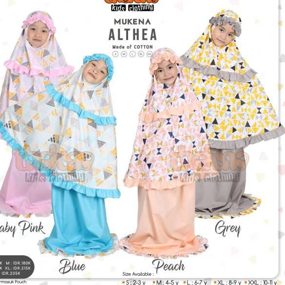 Mukena Anak Althea dari Thaluna Kids ini juga bisa jadi pilihan keren. Produk yang satu ini terbuat dari bahan katun printing. Mukenanya memiliki tekstur halus, lembut, tidak menerawang, dan adem dipakai. Desainnya simpel dengan rempel karet pada bagian dahi dan kepala. Mukena ini memiliki omtif segitiga yang menggemaskan. Ada berbagai pilihan warna yang menarik yang bisa dipilih. Produk legnkap dengan pouch dari bahan mika tebal dengan resleting dan mudah dibawa bepergian. Pouchnya anti air sehingga praktis untuk digunakan. Ada ukuran S hingga XL yang bisa dipilih.