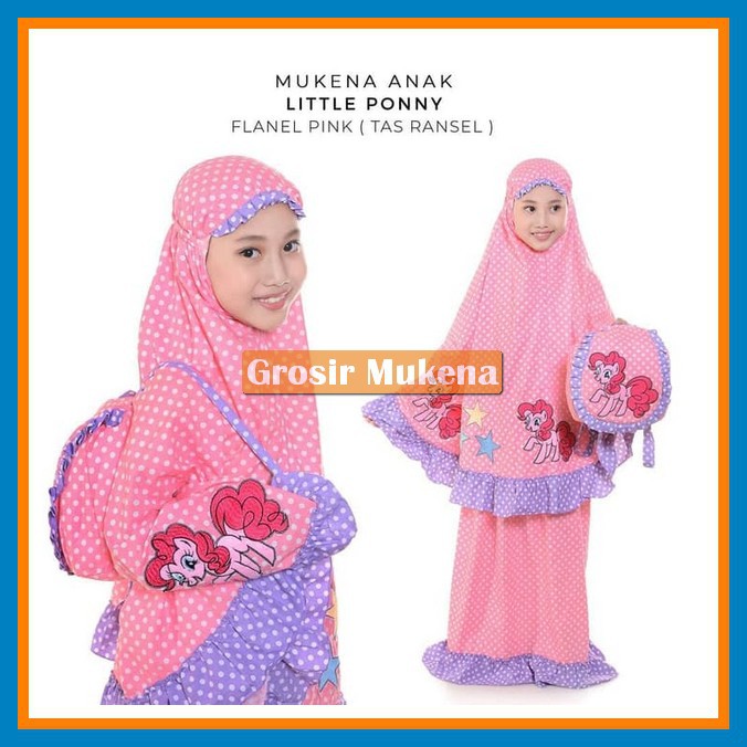Jangan lewatkan juga Mukena Anak Katun Little Pony Flanel Pink. Warna pink tentu jadi warna favorit kebanyakan anak perempuan. Buah hati Anda tentu menyukai mukena ini karena ada motif kartun Little Pony yang keren. Mukena ini terbuat dari bahan flanel yang nyaman. Ada tas yang melengkapi mukena atasan dan bawahan ini. Produk bisa dibeli dalam ukuran XS hingga XXL. Tas mukena bisa ditenteng dan bisa dipakai seperti ransel. Mukena tersedia untuk anak usia 2 hingga 13 tahun.