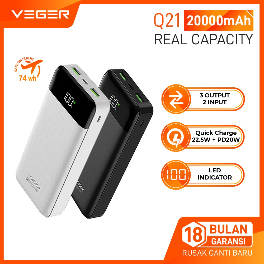 Veger Powerbank 20000mAh Q21 adalah power bank yang tidak mudah panas saat digunakan untuk mengisi daya atau saat diisi daya. Keunggulan lainnya adalah keamanannya untuk dibawa masuk ke pesawat karena daya power bank ini hanya 74 Wh. Power bank ini dilengkapi dengan dua port USB yang mendukung quick charge, sehingga pengisian daya dapat dilakukan dengan cepat.