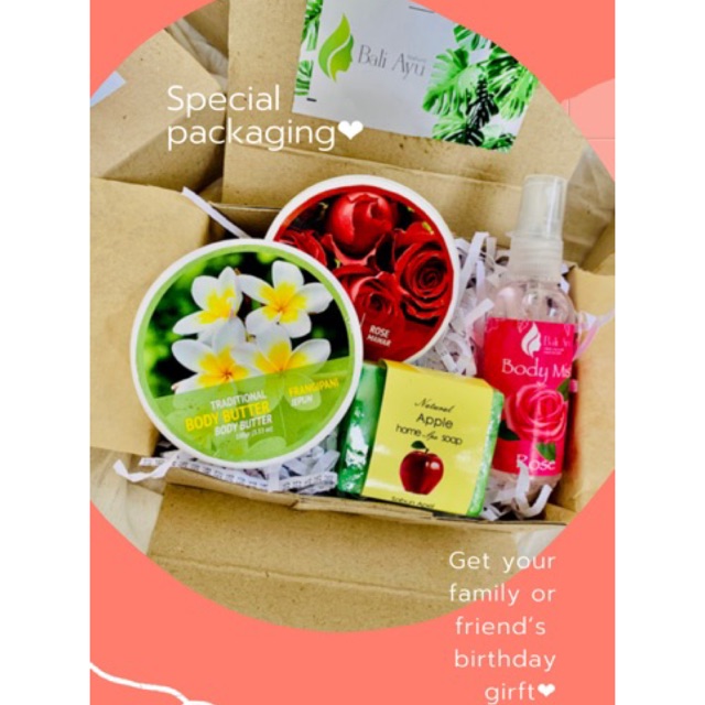 Selain makeup, kamu bisa memberikan beauty gift box. Sama halnya dengan hampers makeup, beauty gift box ini bisa kamu isi satuan atau satu produk yang sama. Salah satu rekomendasinya ada Beauty Gift Box Bali Ayu. Di dalamnya terdapat body butter Bali Ayu berbagai aroma, body scrub Bali Ayu berbagai aroma, sabun texture Bali Ayu, dan body mist Bali Ayu.