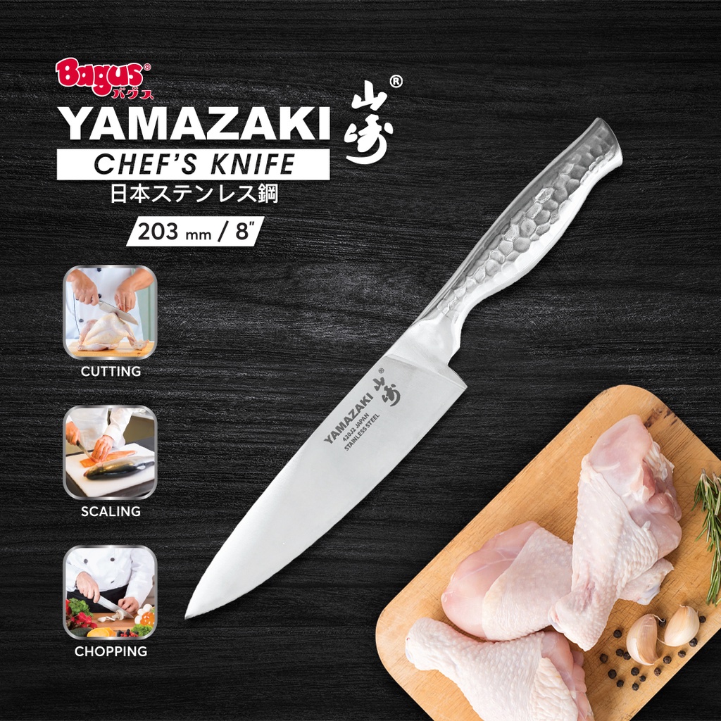 Bagus Yamazaki Chef's Knife merupakan salah satu pisau dapur yang menjadi andalan para koki dalam memasak. Pisau ini terbuat dari bahan Japan Stainless Steel yang tajam dan kuat. Handle dengan hollow yang ergonomis dan nyaman digunakan.