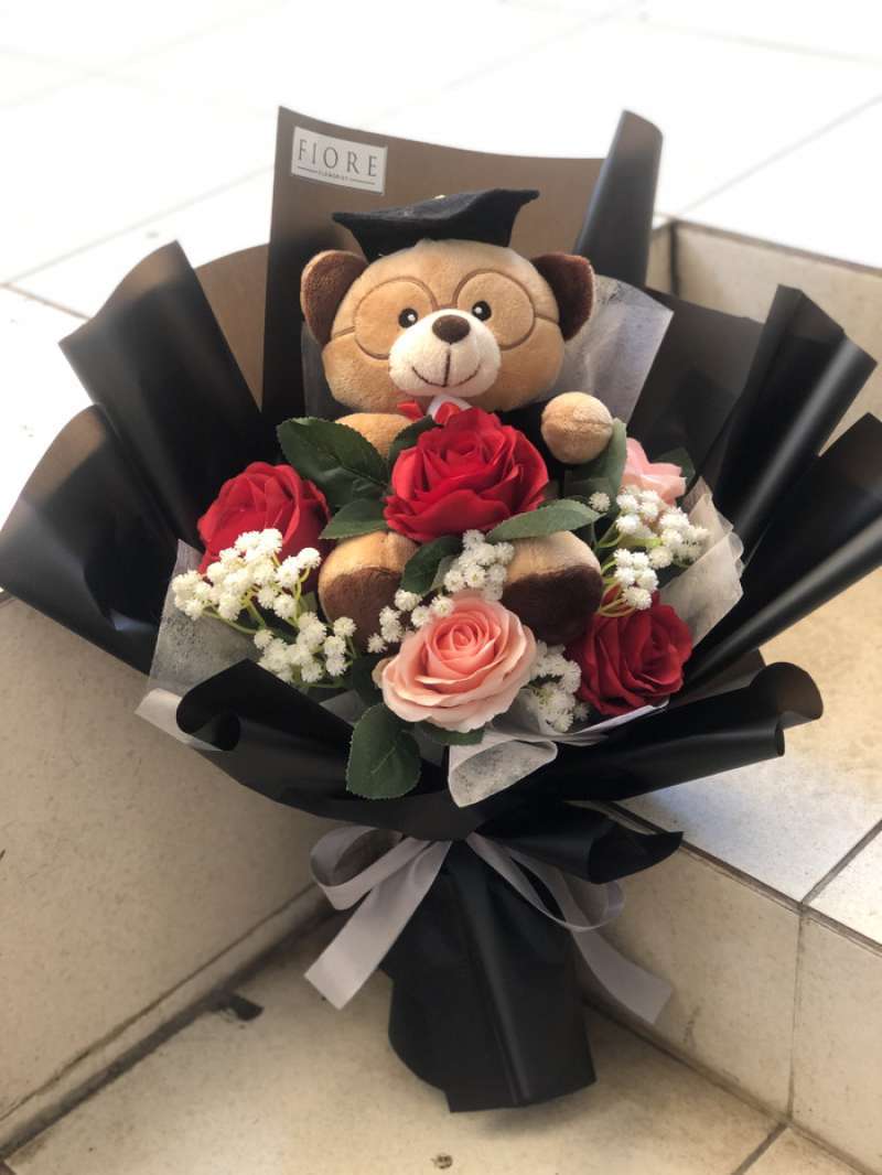 Hand Bouquet - 706 Buket Bunga Wisuda, Valentine, dan Cantik (Bunga Fresh) menjadi pilihan hadiah yang bermakna untuk merayakan momen bersejarah kelulusan. Buket bunga wisuda bukan hanya sekadar tanda selamat, tetapi juga ungkapan kebanggaan dan kebahagiaan atas pencapaian akademis. Keberagaman dalam bentuk, ukuran, dan warna buket bunga menambah sentuhan personal, sementara tambahan boneka teddy bear dengan jubah hitam dan toga wisuda memberikan nuansa lucu dan menggemaskan pada hadiah istimewa ini.